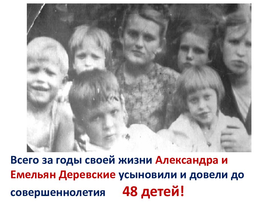В сего за годы своей жизни Александра и Емельян Деревские усыновили и довели до совершеннолетия 48 детей!