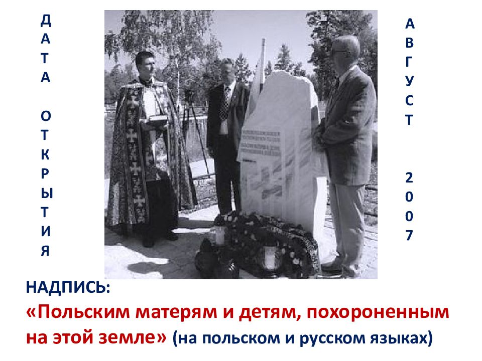 НАДПИСЬ: «Польским матерям и детям, похороненным на этой земле» (на польском и русском языках ) Д А Т А О Т К Р Ы Т И Я А В Г У С Т 2 0 0 7