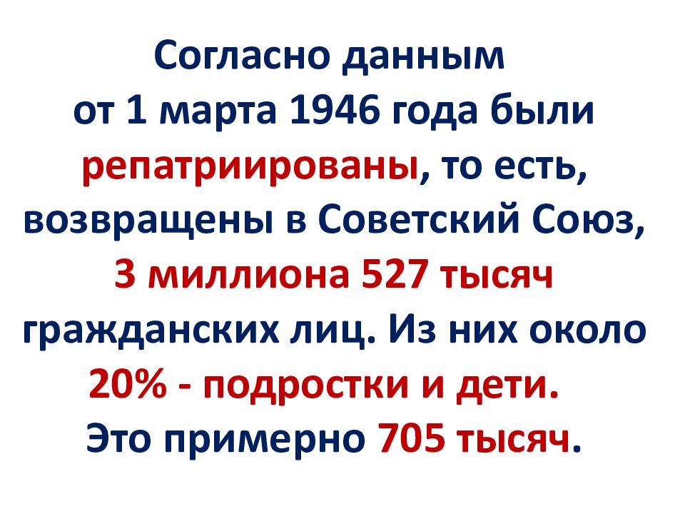 С огласно данным от 1 марта 1946 года были репатриированы, то есть, возвращены в Советский Союз, 3 миллиона 527 тысяч гражданских лиц. Из них около 20% - подростки и дети. Это примерно 705 тысяч.