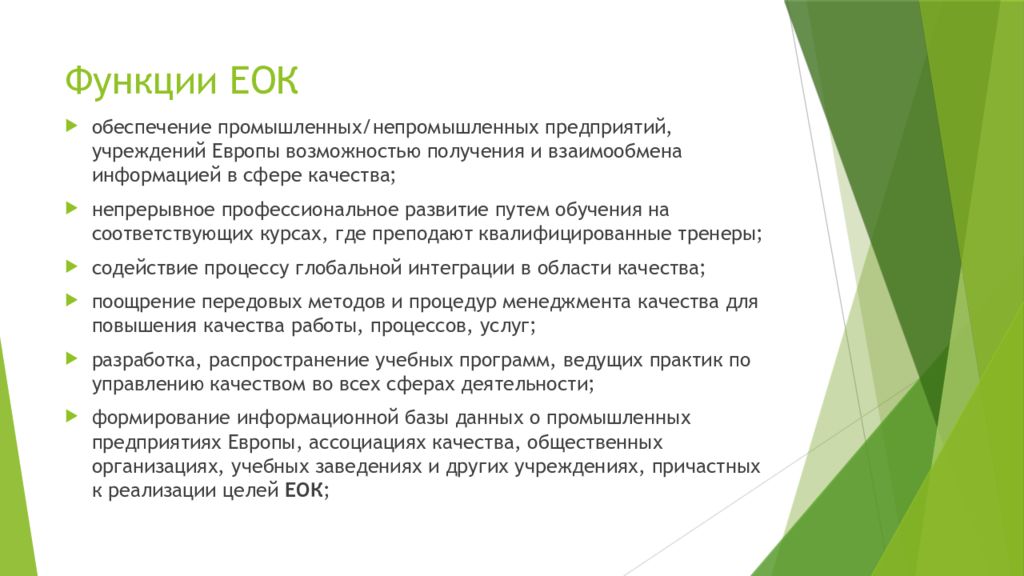 обеспечение промышленных/непромышленных предприятий, учреждений Европы возможностью получения и взаимообмена информацией в сфере качества; непрерывное профессиональное развитие путем обучения на соответствующих курсах, где преподают квалифицированные тренеры; содействие процессу глобальной интеграции в области качества; поощрение передовых методов и процедур менеджмента качества для повышения качества работы, процессов, услуг; разработка, распространение учебных программ, ведущих практик по управлению качеством во всех сферах деятельности; формирование информационной базы данных о промышленных предприятиях Европы, ассоциациях качества, общественных организациях, учебных заведениях и других учреждениях, причастных к реализации целей ЕОК ;