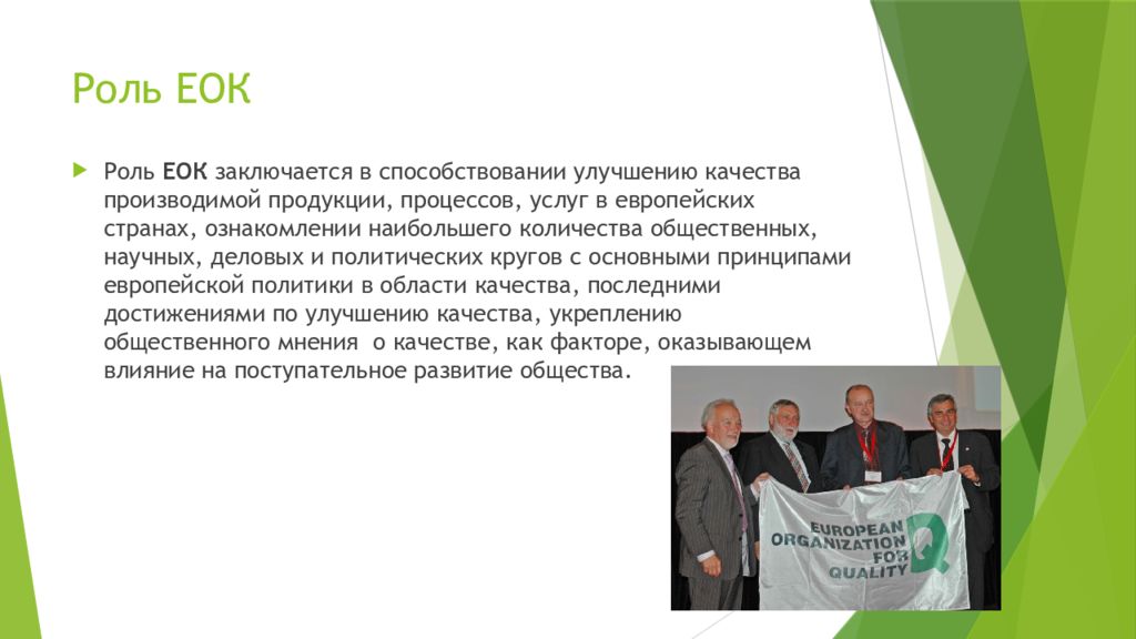 Роль ЕОК заключается в способствовании улучшению качества производимой продукции, процессов, услуг в европейских странах, ознакомлении наибольшего количества общественных, научных, деловых и политических кругов с основными принципами европейской политики в области качества, последними достижениями по улучшению качества, укреплению общественного мнения о качестве, как факторе, оказывающем влияние на поступательное развитие общества.