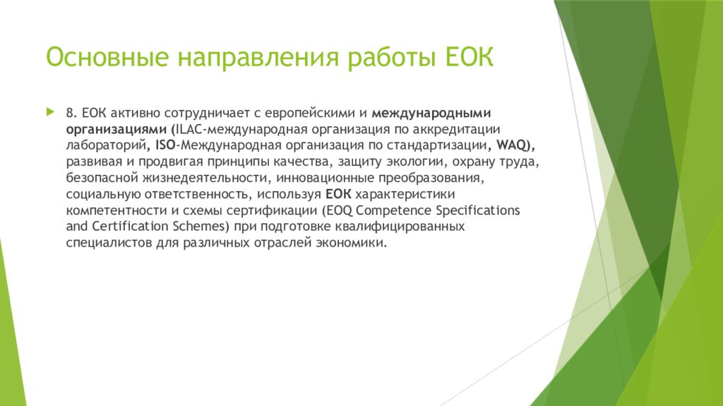 8. ЕОК активно сотрудничает с европейскими и международными организациями ( ILAC-международная организация по аккредитации лабораторий, ISO -Международная организация по стандартизации, WAQ), развивая и продвигая принципы качества, защиту экологии, охрану труда, безопасной жизнедеятельности, инновационные преобразования, социальную ответственность, используя ЕОК характеристики компетентности и схемы сертификации (EOQ Competence Specifications and Certification Schemes ) при подготовке квалифицированных специалистов для различных отраслей экономики.
