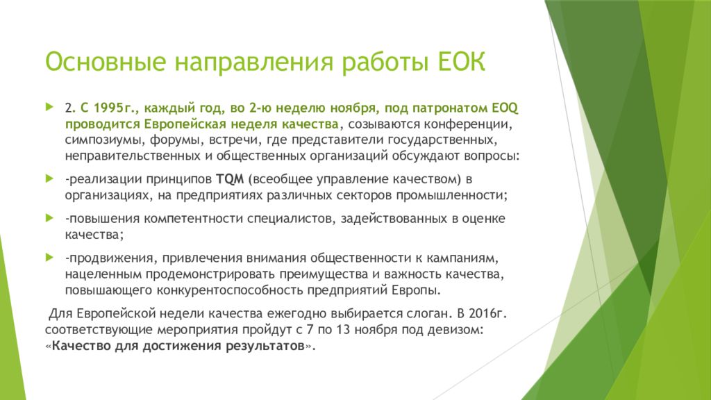 2. С 1995г., каждый год, во 2-ю неделю ноября, под патронатом EOQ проводится Европейская неделя качества, созываются конференции, симпозиумы, форумы, встречи, где представители государственных, неправительственных и общественных организаций обсуждают вопросы: -реализации принципов TQM (всеобщее управление качеством) в организациях, на предприятиях различных секторов промышленности; -повышения компетентности специалистов, задействованных в оценке качества; -продвижения, привлечения внимания общественности к кампаниям, нацеленным продемонстрировать преимущества и важность качества, повышающего конкурентоспособность предприятий Европы. Для Европейской недели качества ежегодно выбирается слоган. В 2016г. соответствующие мероприятия пройдут с 7 по 13 ноября под девизом: « Качество для достижения результатов ».