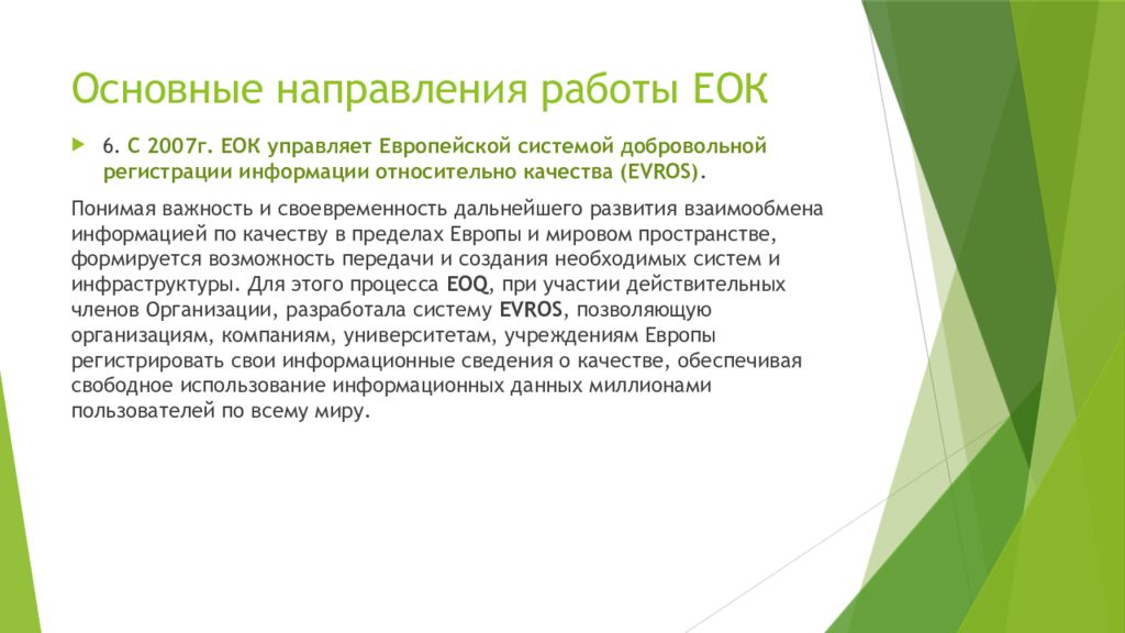 6. С 2007г. ЕОК управляет Европейской системой добровольной регистрации информации относительно качества (EVROS). Понимая важность и своевременность дальнейшего развития взаимообмена информацией по качеству в пределах Европы и мировом пространстве, формируется возможность передачи и создания необходимых систем и инфраструктуры. Для этого процесса EOQ, при участии действительных членов Организации, разработала систему EVROS, позволяющую организациям, компаниям, университетам, учреждениям Европы регистрировать свои информационные сведения о качестве, обеспечивая свободное использование информационных данных миллионами пользователей по всему миру.
