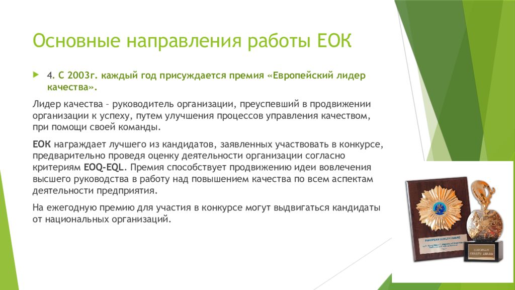 4. С 2003г. каждый год присуждается премия «Европейский лидер качества». Лидер качества – руководитель организации, преуспевший в продвижении организации к успеху, путем улучшения процессов управления качеством, при помощи своей команды. ЕОК награждает лучшего из кандидатов, заявленных участвовать в конкурсе, предварительно проведя оценку деятельности организации согласно критериям EOQ-EQL. Премия способствует продвижению идеи вовлечения высшего руководства в работу над повышением качества по всем аспектам деятельности предприятия. На ежегодную премию для участия в конкурсе могут выдвигаться кандидаты от национальных организаций.