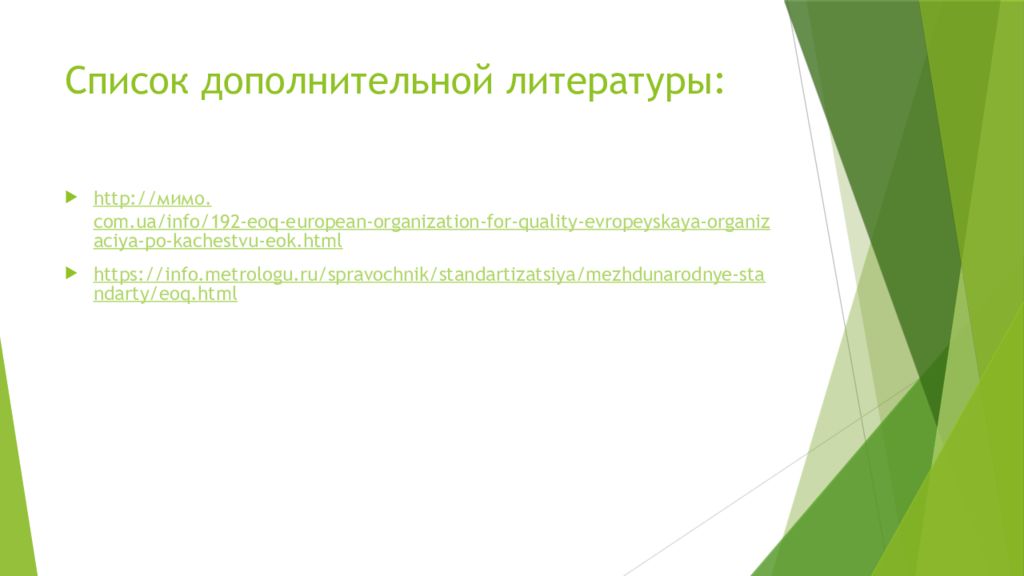 http:// мимо. com.ua/info/192-eoq-european-organization-for-quality-evropeyskaya-organizaciya-po-kachestvu-eok.html https://info.metrologu.ru/spravochnik/standartizatsiya/mezhdunarodnye-standarty/eoq.html