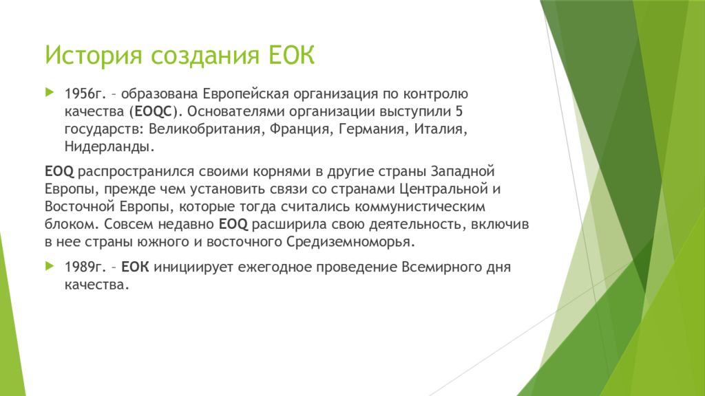 1956г. – образована Европейская организация по контролю качества ( EOQC ). Основателями организации выступили 5 государств: Великобритания, Франция, Германия, Италия, Нидерланды. EOQ распространился своими корнями в другие страны Западной Европы, прежде чем установить связи со странами Центральной и Восточной Европы, которые тогда считались коммунистическим блоком. Совсем недавно EOQ расширила свою деятельность, включив в нее страны южного и восточного Средиземноморья. 1989г. – ЕОК инициирует ежегодное проведение Всемирного дня качества.