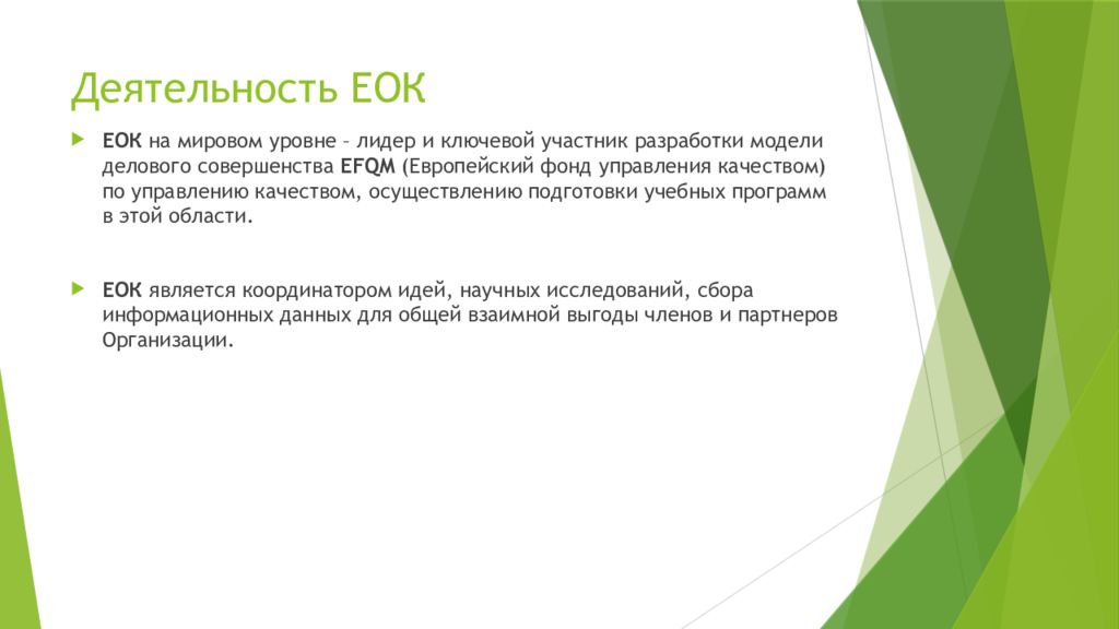 ЕОК на мировом уровне – лидер и ключевой участник разработки модели делового совершенства EFQM (Европейский фонд управления качеством) по управлению качеством, осуществлению подготовки учебных программ в этой области. ЕОК является координатором идей, научных исследований, сбора информационных данных для общей взаимной выгоды членов и партнеров Организации.