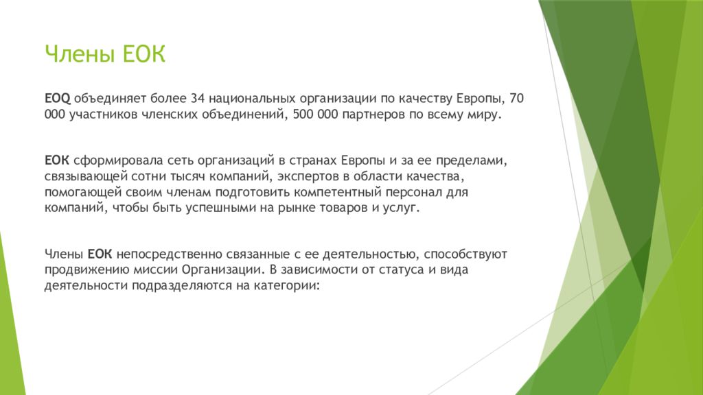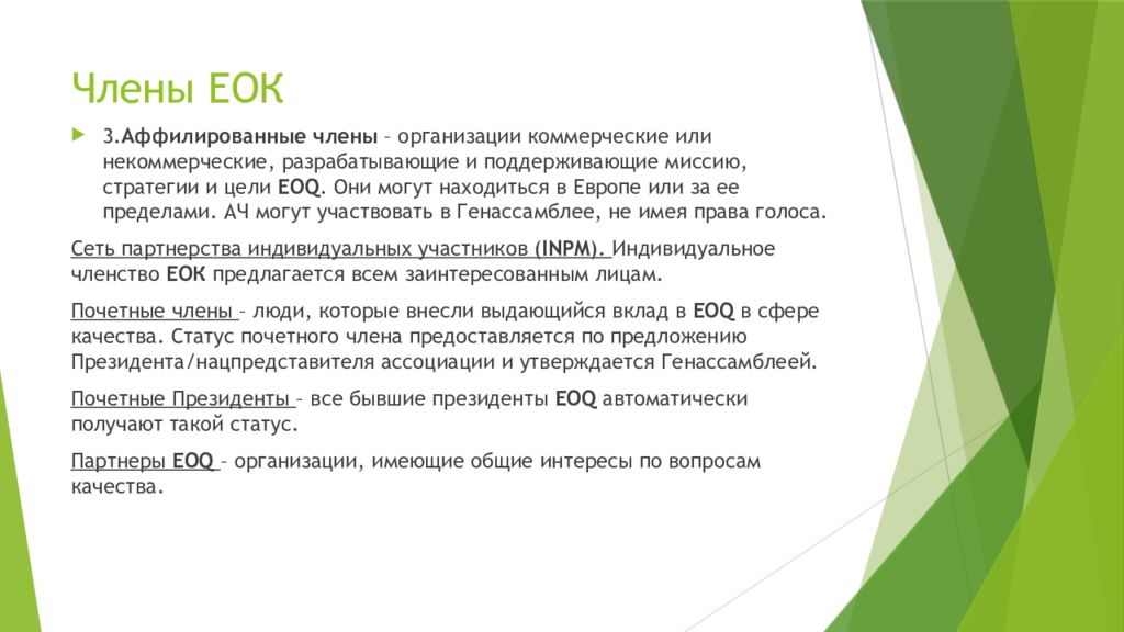 3. Аффилированные члены – организации коммерческие или некоммерческие, разрабатывающие и поддерживающие миссию, стратегии и цели EOQ. Они могут находиться в Европе или за ее пределами. АЧ могут участвовать в Генассамблее, не имея права голоса. Сеть партнерства индивидуальных участников ( INPM ). Индивидуальное членство ЕОК предлагается всем заинтересованным лицам. Почетные члены – люди, которые внесли выдающийся вклад в EOQ в сфере качества. Статус почетного члена предоставляется по предложению Президента/ нацпредставителя ассоциации и утверждается Генассамблеей. Почетные Президенты – все бывшие президенты EOQ автоматически получают такой статус. Партнеры EOQ – организации, имеющие общие интересы по вопросам качества.