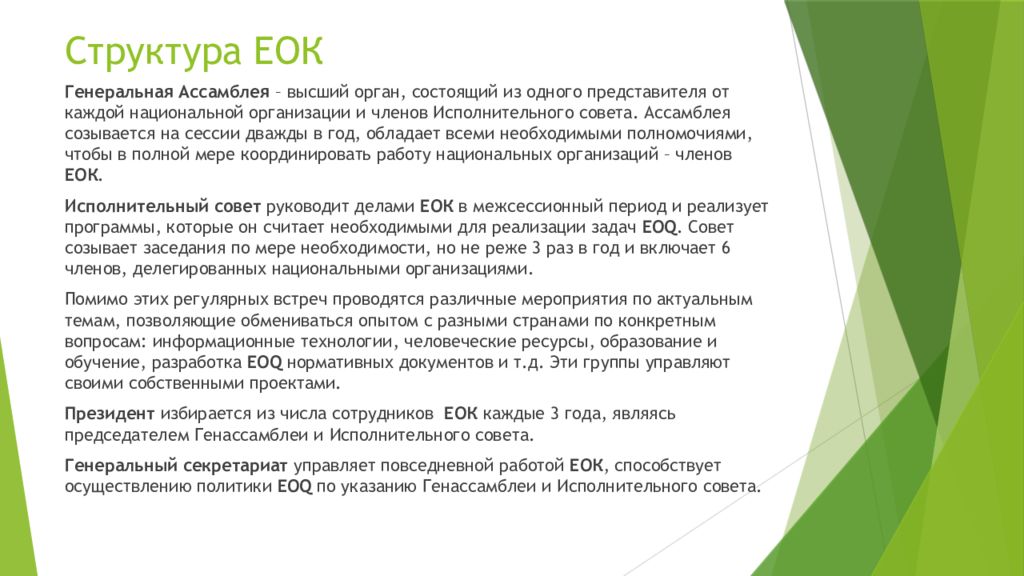 Генеральная Ассамблея – высший орган, состоящий из одного представителя от каждой национальной организации и членов Исполнительного совета. Ассамблея созывается на сессии дважды в год, обладает всеми необходимыми полномочиями, чтобы в полной мере координировать работу национальных организаций – членов ЕОК. Исполнительный совет руководит делами ЕОК в межсессионный период и реализует программы, которые он считает необходимыми для реализации задач EOQ. Совет созывает заседания по мере необходимости, но не реже 3 раз в год и включает 6 членов, делегированных национальными организациями. Помимо этих регулярных встреч проводятся различные мероприятия по актуальным темам, позволяющие обмениваться опытом с разными странами по конкретным вопросам: информационные технологии, человеческие ресурсы, образование и обучение, разработка EOQ нормативных документов и т.д. Эти группы управляют своими собственными проектами. Президент избирается из числа сотрудников ЕОК каждые 3 года, являясь председателем Генассамблеи и Исполнительного совета. Генеральный секретариат управляет повседневной работой ЕОК, способствует осуществлению политики EOQ по указанию Генассамблеи и Исполнительного совета.