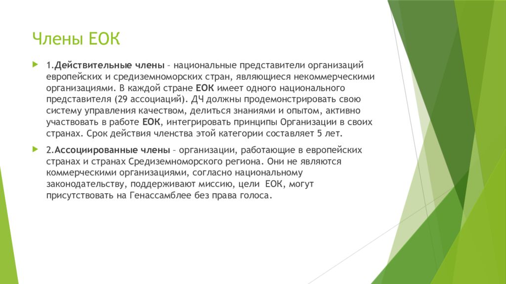 1. Действительные члены – национальные представители организаций европейских и средиземноморских стран, являющиеся некоммерческими организациями. В каждой стране ЕОК имеет одного национального представителя (29 ассоциаций). ДЧ должны продемонстрировать свою систему управления качеством, делиться знаниями и опытом, активно участвовать в работе ЕОК, интегрировать принципы Организации в своих странах. Срок действия членства этой категории составляет 5 лет. 2. Ассоциированные члены – организации, работающие в европейских странах и странах Средиземноморского региона. Они не являются коммерческими организациями, согласно национальному законодательству, поддерживают миссию, цели ЕОК, могут присутствовать на Генассамблее без права голоса.