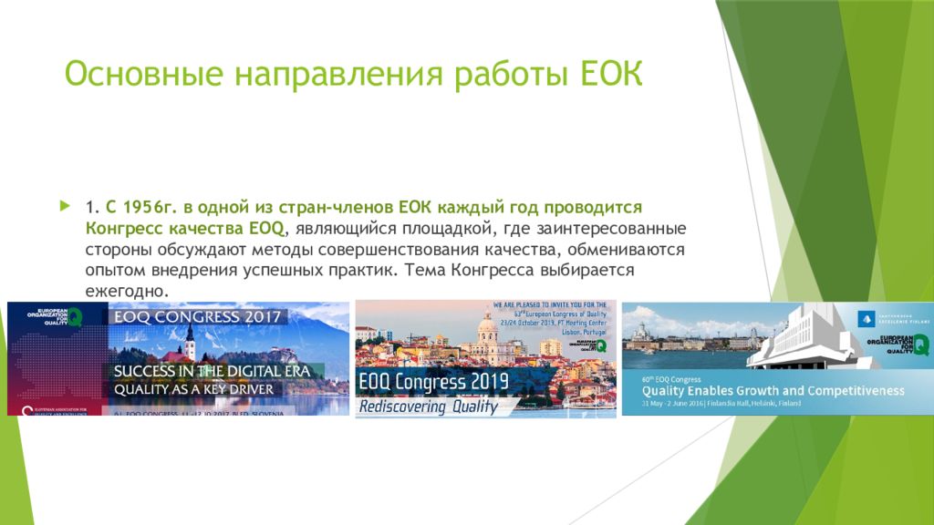 1. С 1956г. в одной из стран-членов ЕОК каждый год проводится Конгресс качества EOQ, являющийся площадкой, где заинтересованные стороны обсуждают методы совершенствования качества, обмениваются опытом внедрения успешных практик. Тема Конгресса выбирается ежегодно.