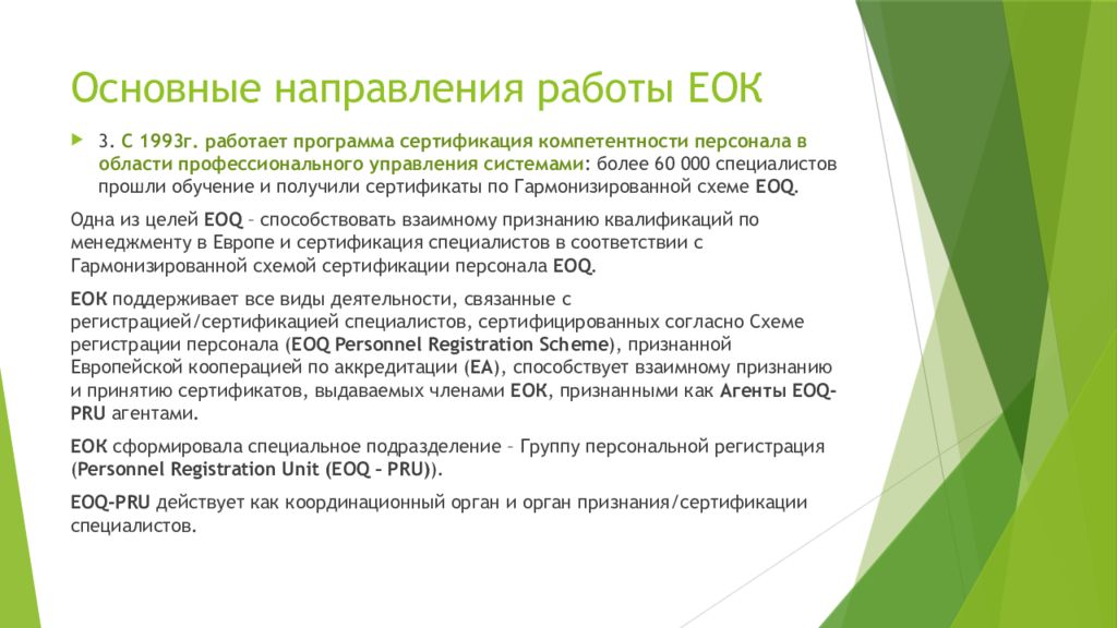 3. С 1993г. работает программа сертификация компетентности персонала в области профессионального управления системами : более 60 000 специалистов прошли обучение и получили сертификаты по Гармонизированной схеме EOQ. Одна из целей EOQ – способствовать взаимному признанию квалификаций по менеджменту в Европе и сертификация специалистов в соответствии с Гармонизированной схемой сертификации персонала EOQ. ЕОК поддерживает все виды деятельности, связанные с регистрацией/сертификацией специалистов, сертифицированных согласно Схеме регистрации персонала ( EOQ Personnel Registration Scheme ), признанной Европейской кооперацией по аккредитации ( ЕА ), способствует взаимному признанию и принятию сертификатов, выдаваемых членами ЕОК, признанными как Агенты EOQ-PRU агентами. ЕОК сформировала специальное подразделение – Группу персональной регистрация ( Personnel Registration Unit (EOQ – PRU) ). EOQ-PRU действует как координационный орган и орган признания/сертификации специалистов.