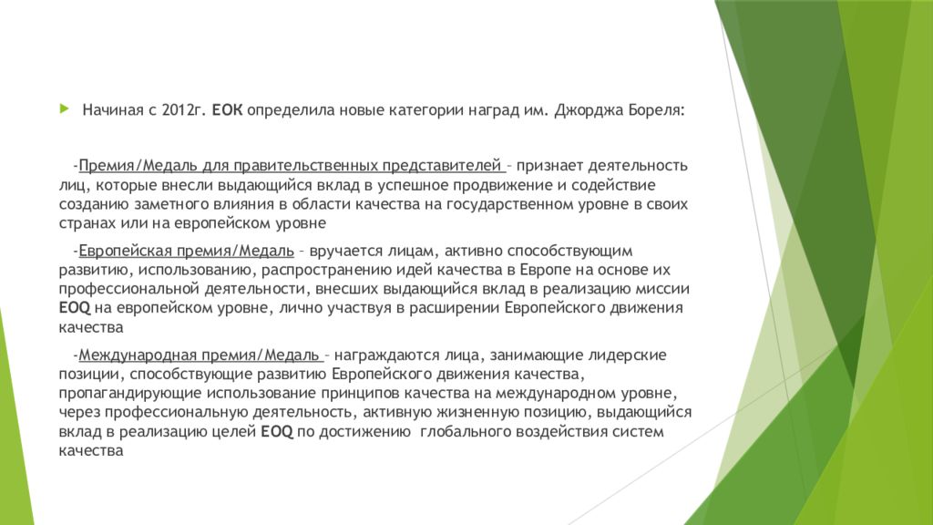 Начиная с 2012г. ЕОК определила новые категории наград им. Джорджа Бореля: - Премия/Медаль для правительственных представителей – признает деятельность лиц, которые внесли выдающийся вклад в успешное продвижение и содействие созданию заметного влияния в области качества на государственном уровне в своих странах или на европейском уровне - Европейская премия/Медаль – вручается лицам, активно способствующим развитию, использованию, распространению идей качества в Европе на основе их профессиональной деятельности, внесших выдающийся вклад в реализацию миссии EOQ на европейском уровне, лично участвуя в расширении Европейского движения качества - Международная премия/Медаль – награждаются лица, занимающие лидерские позиции, способствующие развитию Европейского движения качества, пропагандирующие использование принципов качества на международном уровне, через профессиональную деятельность, активную жизненную позицию, выдающийся вклад в реализацию целей EOQ по достижению глобального воздействия систем качества