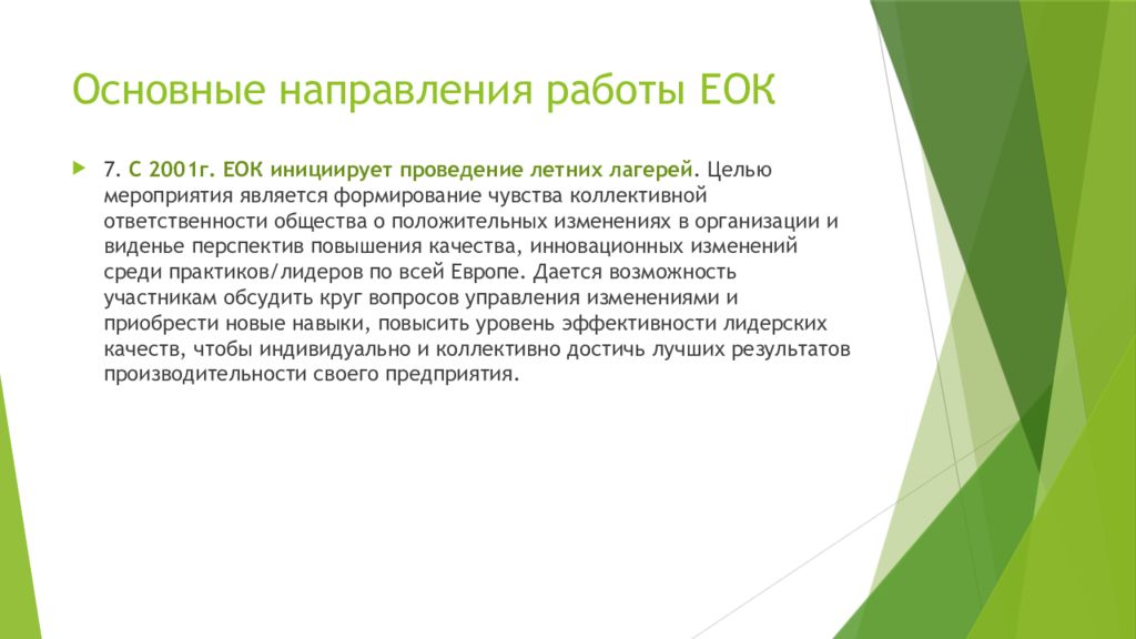 7. С 2001г. ЕОК инициирует проведение летних лагерей. Целью мероприятия является формирование чувства коллективной ответственности общества о положительных изменениях в организации и виденье перспектив повышения качества, инновационных изменений среди практиков/лидеров по всей Европе. Дается возможность участникам обсудить круг вопросов управления изменениями и приобрести новые навыки, повысить уровень эффективности лидерских качеств, чтобы индивидуально и коллективно достичь лучших результатов производительности своего предприятия.