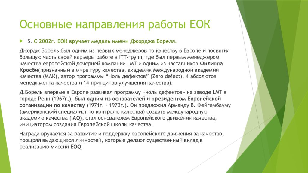 5. С 2002г. ЕОК вручает медаль имени Джорджа Бореля. Джордж Борель был одним из первых менеджеров по качеству в Европе и посвятил большую часть своей карьеры работе в ITT-групп, где был первым менеджером качества европейской дочерней компании LMT и одним из наставников Филиппа Кросби (признанный в мире гуру качества, академик Международной академии качества (МАК), автор программы “Ноль дефектов” ( Zero defect ), 4 абсолютов менеджмента качества и 14 принципов улучшения качества). Д.Борель впервые в Европе развивал программу «ноль дефектов» на заводе LMT в городе Ренн (1967г.), был одним из основателей и президентом Европейской организации по качеству (1971г. – 1973г.). Он предложил Арманду В. Фейгембауму (американский специалист по контролю качества) создать международную академию качества ( IAQ ), стал основателем Европейского движения качества, инициатором создания Европейской школы качества. Награда вручается за развитие и поддержку европейского движения за качество, поощряя выдающихся личностей, которые делают существенный вклад в реализацию миссии EOQ.