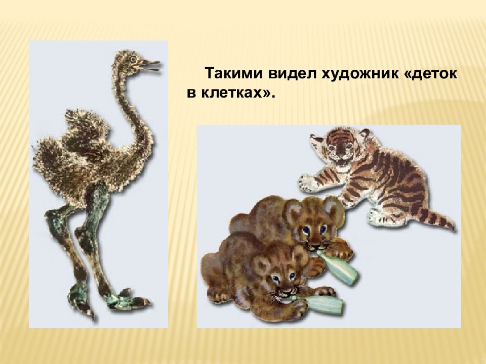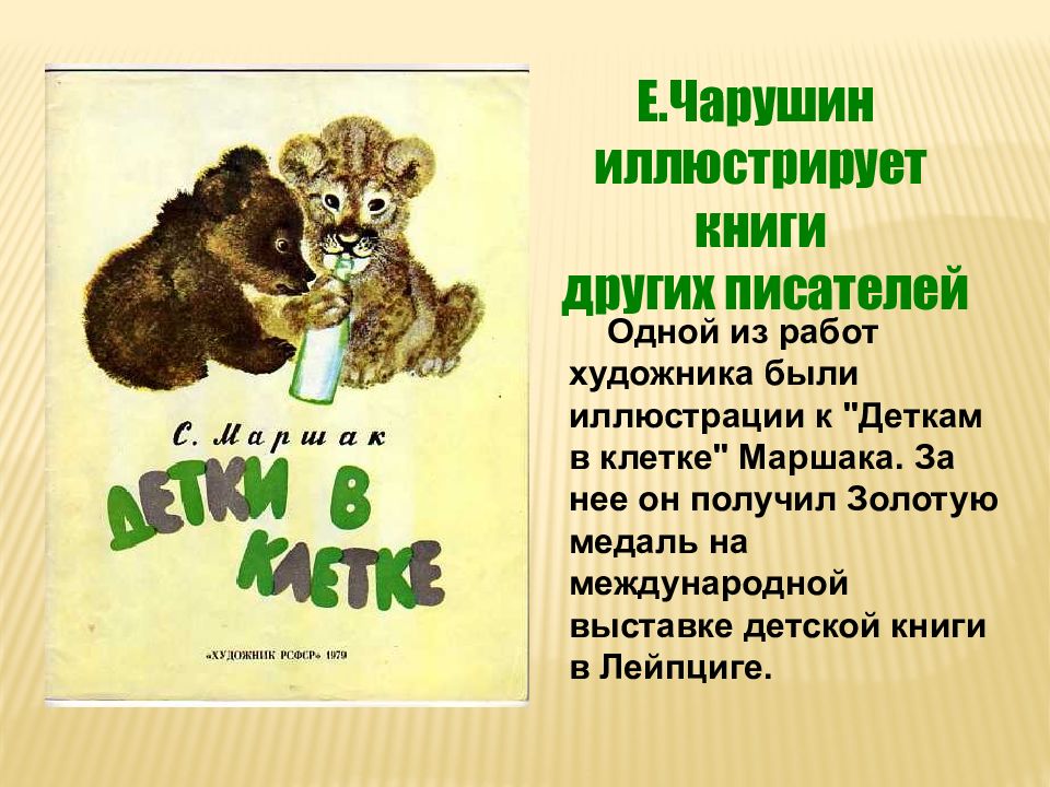 Е.Чарушин иллюстрирует книги других писателей Одной из работ художника были иллюстрации к "Деткам в клетке" Маршака. За нее он получил Золотую медаль на международной выставке детской книги в Лейпциге.