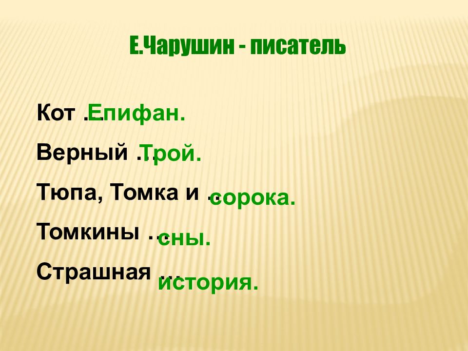 Е.Чарушин - писатель Кот … Верный … Тюпа, Томка и … Томкины … Страшная … Епифан. Трой. сорока. сны. история.