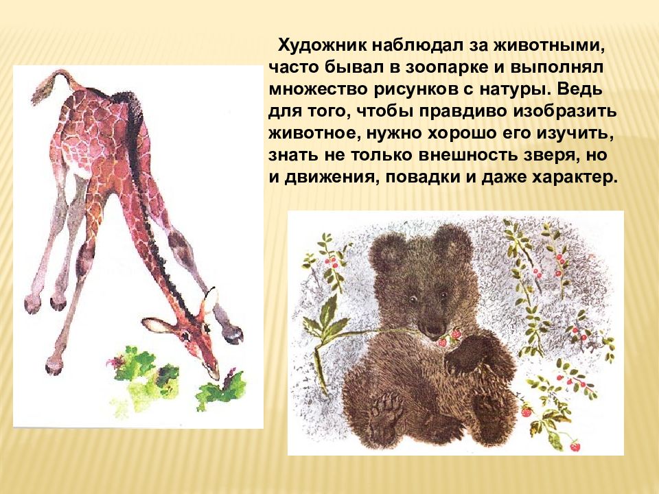 Художник наблюдал за животными, часто бывал в зоопарке и выполнял множество рисунков с натуры. Ведь для того, чтобы правдиво изобразить животное, нужно хорошо его изучить, знать не только внешность зверя, но и движения, повадки и даже характер.
