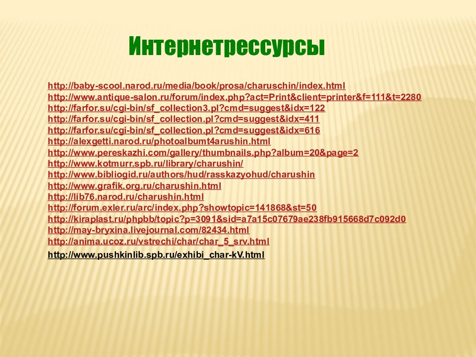 Интернетрессурсы http://baby-scool.narod.ru/media/book/prosa/charuschin/index.html http://www.antique-salon.ru/forum/index.php?act=Print&client=printer&f=111&t=2280 http://farfor.su/cgi-bin/sf_collection3.pl?cmd=suggest&idx=122 http://farfor.su/cgi-bin/sf_collection.pl?cmd=suggest&idx=411 http://farfor.su/cgi-bin/sf_collection.pl?cmd=suggest&idx=616 http://alexgetti.narod.ru/photoalbumt4arushin.html http://www.pereskazhi.com/gallery/thumbnails.php?album=20&page=2 http://www.kotmurr.spb.ru/library/charushin/ http://www.bibliogid.ru/authors/hud/rasskazyohud/charushin http://www.grafik.org.ru/charushin.html http://lib76.narod.ru/charushin.html http://forum.exler.ru/arc/index.php?showtopic=141868&st=50 http://kiraplast.ru/phpbb/topic?p=3091&sid=a7a15c07679ae238fb915668d7c092d0 http://may-bryxina.livejournal.com/82434.html http://anima.ucoz.ru/vstrechi/char/char_5_srv.html http://www.pushkinlib.spb.ru/exhibi_char-kV.html