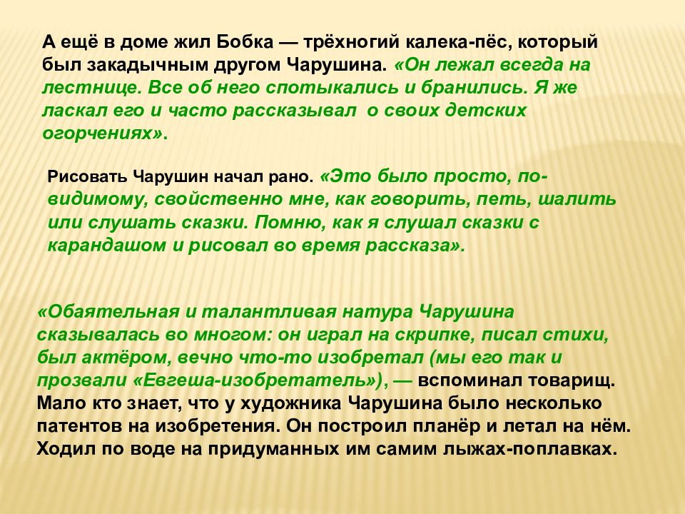 А ещё в доме жил Бобка — трёхногий калека-пёс, который был закадычным другом Чарушина. «Он лежал всегда на лестнице. Все об него спотыкались и бранились. Я же ласкал его и часто рассказывал о своих детских огорчениях». Рисовать Чарушин начал рано. «Это было просто, по-видимому, свойственно мне, как говорить, петь, шалить или слушать сказки. Помню, как я слушал сказки с карандашом и рисовал во время рассказа». «Обаятельная и талантливая натура Чарушина сказывалась во многом: он играл на скрипке, писал стихи, был актёром, вечно что-то изобретал (мы его так и прозвали «Евгеша-изобретатель»), — вспоминал товарищ. Мало кто знает, что у художника Чарушина было несколько патентов на изобретения. Он построил планёр и летал на нём. Ходил по воде на придуманных им самим лыжах-поплавках.