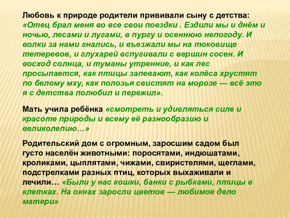 Любовь к природе родители прививали сыну с детства: «Отец брал меня во все свои поездки. Ездили мы и днём и ночью, лесами и лугами, в пургу и осеннюю непогоду. И волки за нами гнались, и въезжали мы на токовище тетеревов, и глухарей вспугивали с вершин сосен. И восход солнца, и туманы утренние, и как лес просыпается, как птицы запевают, как колёса хрустят по белому мху, как полозья свистят на морозе — всё это я с детства полюбил и пережил». Мать учила ребёнка «смотреть и удивляться силе и красоте природы и всему её разнообразию и великолепию…» Родительский дом с огромным, заросшим садом был густо населён животными: поросятами, индюшатами, кроликами, цыплятами, чижами, свиристелями, щеглами, подстрелками разных птиц, которых выхаживали и лечили… «Были у нас кошки, банки с рыбками, птицы в клетках. На окнах заросли цветов — любимое дело матери»