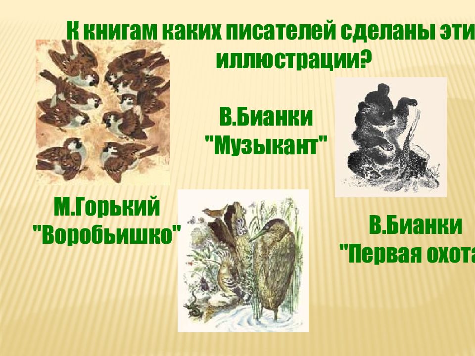 К книгам каких писателей сделаны эти иллюстрации? М.Горький "Воробьишко" В.Бианки "Первая охота" В.Бианки "Музыкант"
