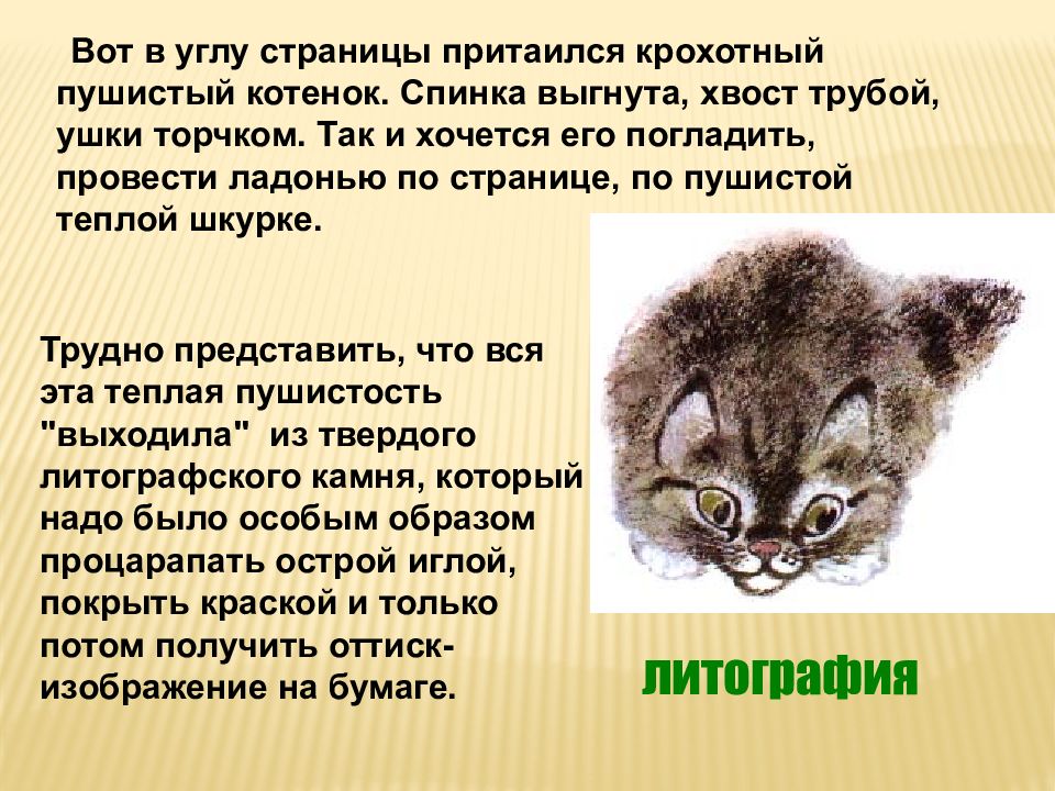 Трудно представить, что вся эта теплая пушистость "выходила" из твердого литографского камня, который надо было особым образом процарапать острой иглой, покрыть краской и только потом получить оттиск-изображение на бумаге. Вот в углу страницы притаился крохотный пушистый котенок. Спинка выгнута, хвост трубой, ушки торчком. Так и хочется его погладить, провести ладонью по странице, по пушистой теплой шкурке. литография