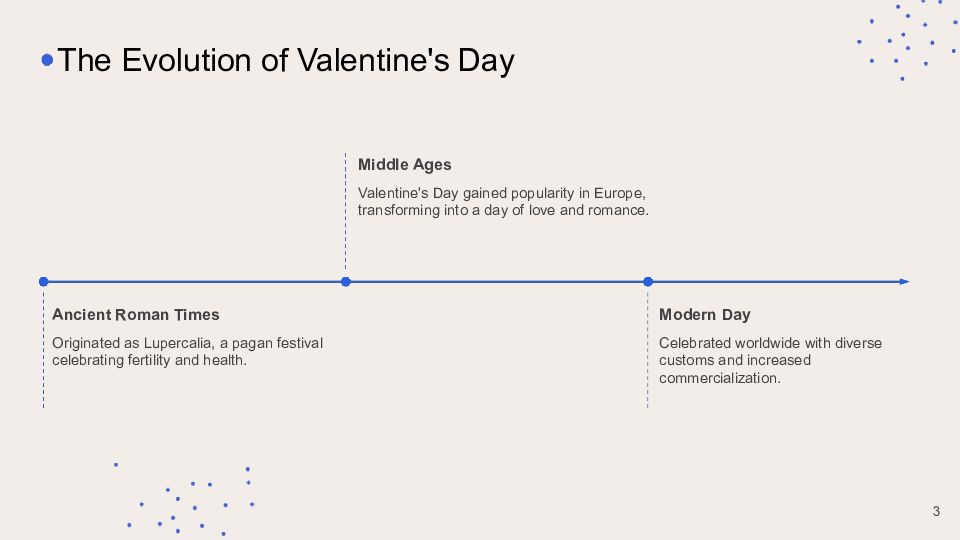 Ancient Roman Times Originated as Lupercalia, a pagan festival celebrating fertility and health. The Evolution of Valentine's Day Middle Ages Valentine's Day gained popularity in Europe, transforming into a day of love and romance. Modern Day Celebrated worldwide with diverse customs and increased commercialization. 3