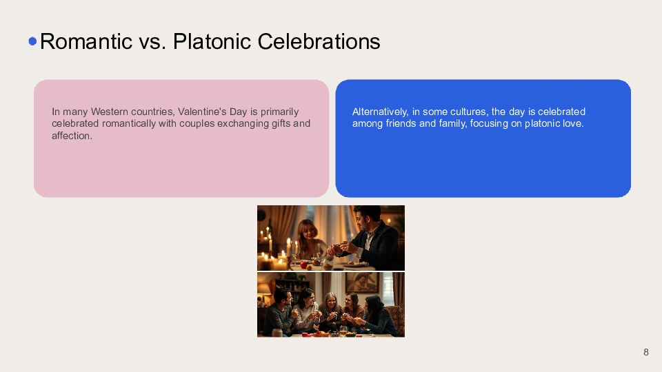 In many Western countries, Valentine's Day is primarily celebrated romantically with couples exchanging gifts and affection. Romantic vs. Platonic Celebrations Alternatively, in some cultures, the day is celebrated among friends and family, focusing on platonic love. 8