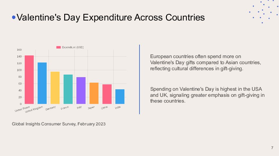 Global Insights Consumer Survey, February 2023 Valentine's Day Expenditure Across Countries European countries often spend more on Valentine's Day gifts compared to Asian countries, reflecting cultural differences in gift-giving. Spending on Valentine's Day is highest in the USA and UK, signaling greater emphasis on gift-giving in these countries. 7