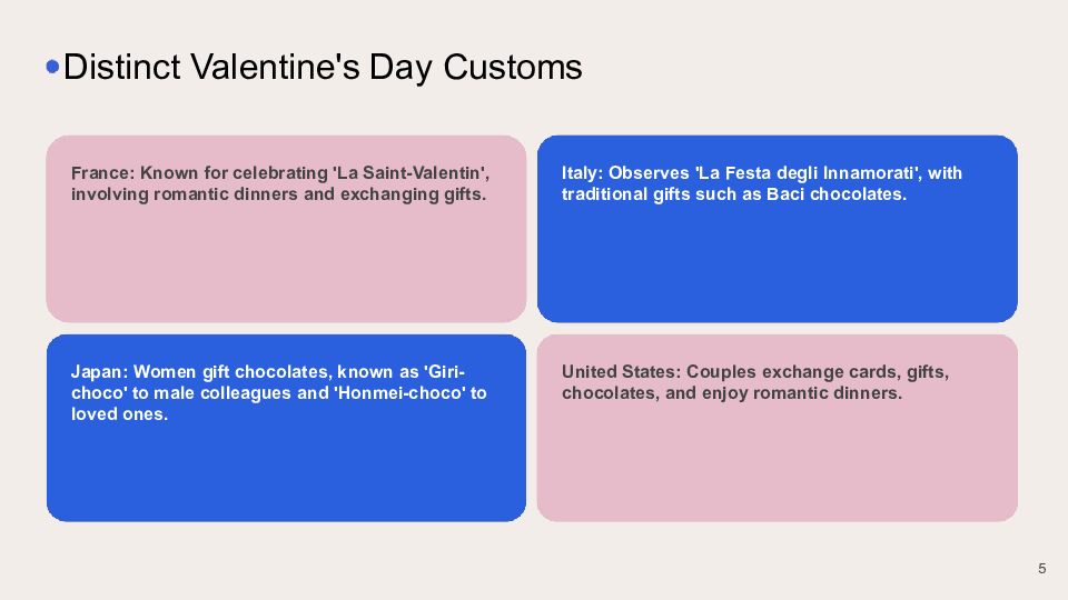 Italy: Observes 'La Festa degli Innamorati', with traditional gifts such as Baci chocolates. France: Known for celebrating 'La Saint-Valentin', involving romantic dinners and exchanging gifts. United States: Couples exchange cards, gifts, chocolates, and enjoy romantic dinners. Japan: Women gift chocolates, known as 'Giri-choco' to male colleagues and 'Honmei-choco' to loved ones. Distinct Valentine's Day Customs 5