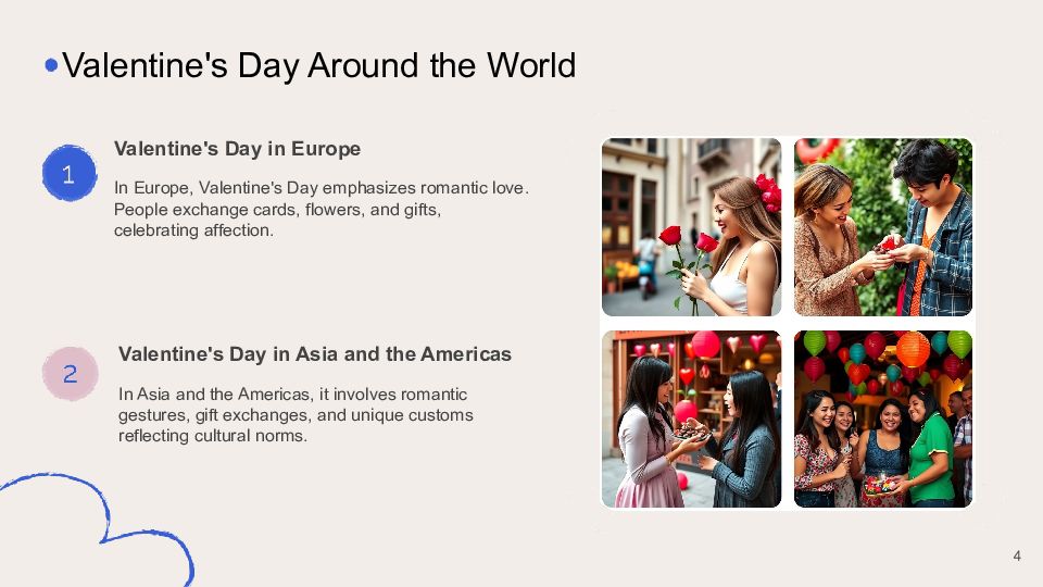 In Europe, Valentine's Day emphasizes romantic love. People exchange cards, flowers, and gifts, celebrating affection. Valentine's Day in Europe In Asia and the Americas, it involves romantic gestures, gift exchanges, and unique customs reflecting cultural norms. Valentine's Day in Asia and the Americas Valentine's Day Around the World 4