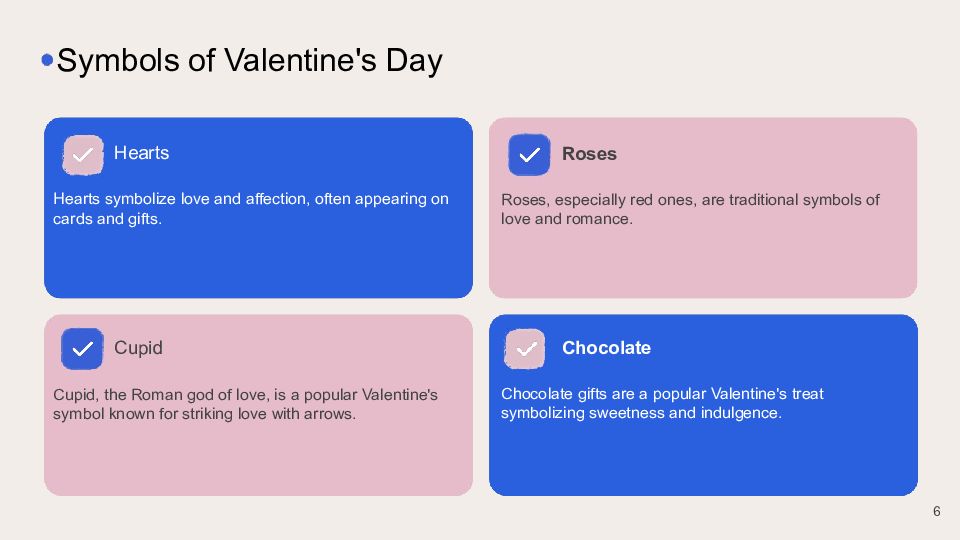 Hearts symbolize love and affection, often appearing on cards and gifts. Hearts Roses, especially red ones, are traditional symbols of love and romance. Roses Symbols of Valentine's Day Cupid, the Roman god of love, is a popular Valentine's symbol known for striking love with arrows. Cupid Chocolate gifts are a popular Valentine's treat symbolizing sweetness and indulgence. Chocolate 6