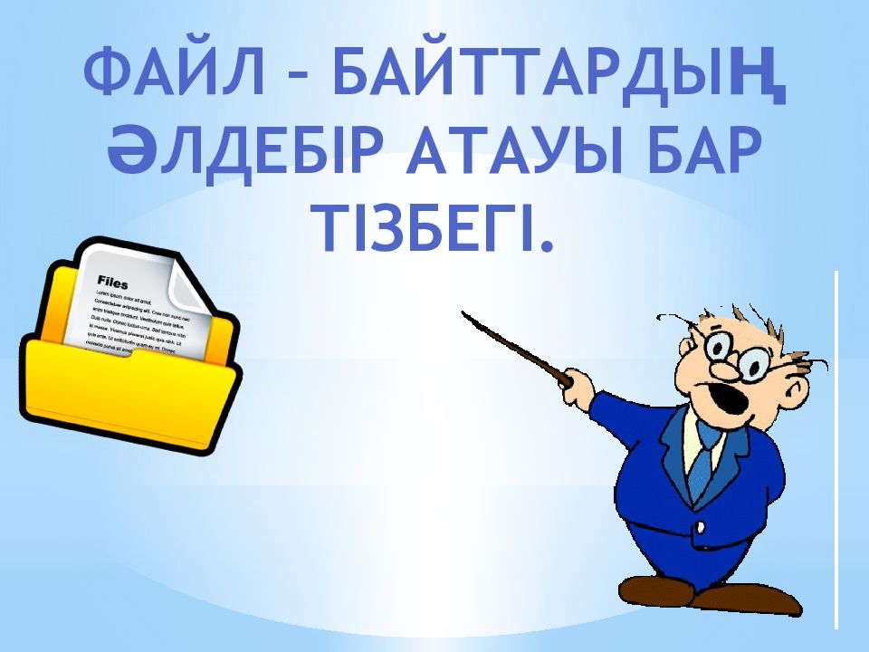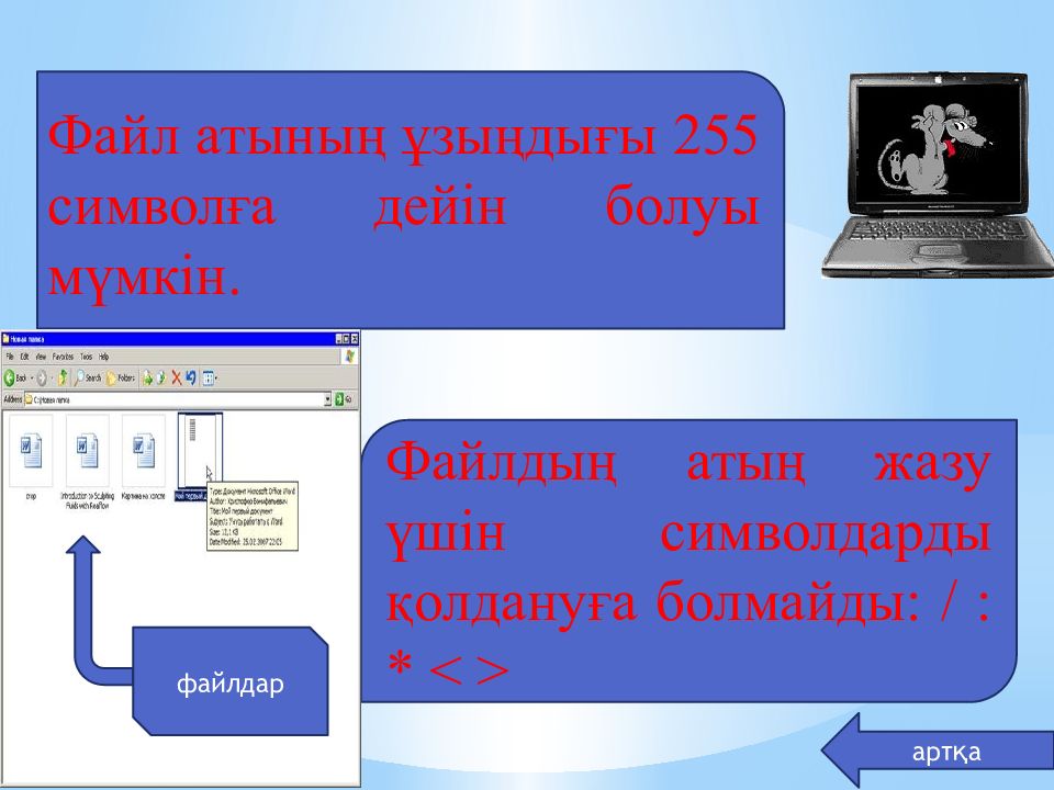 Файл атының ұзыңдығы 255 символға дейін болуы мүмкін. Файлдың атың жазу үшін символдарды қолдануға болмайды: / : * < > артқа файлдар