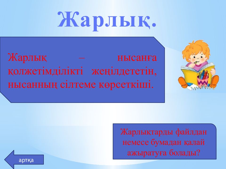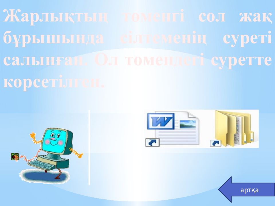 Жарлық. Жарлық – нысанға қолжетімділікті жеңілдететін, нысанның сілтеме көрсеткіші. артқа Жарлықтарды файлдан немесе бумадан қалай ажыратуға болады?