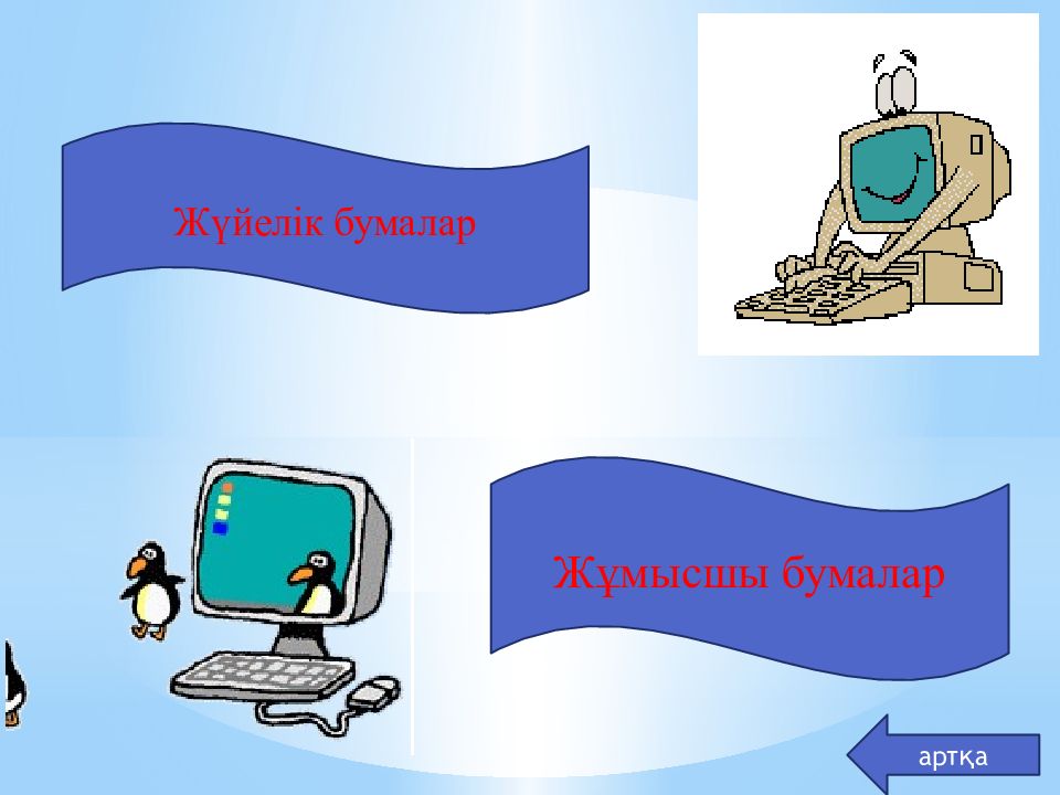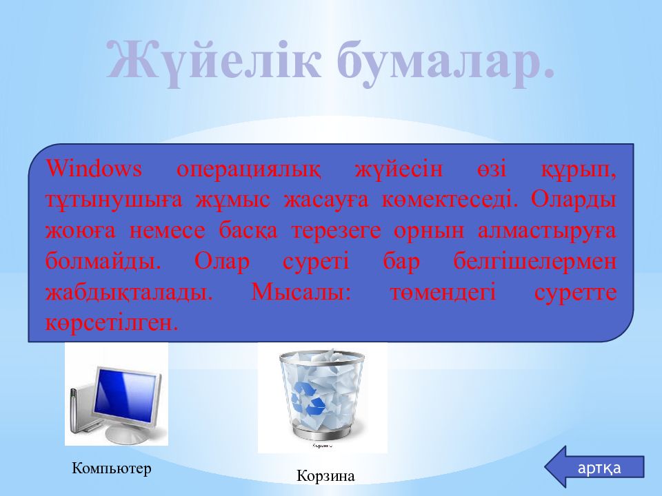 Жүйелік бумалар. Windows операциялық жүйесін өзі құрып, тұтынушыға жұмыс жасауға көмектеседі. Оларды жоюға немесе басқа терезеге орнын алмастыруға болмайды. Олар суреті бар белгішелермен жабдықталады. Мысалы: төмендегі суретте көрсетілген. артқа Компьютер Корзина