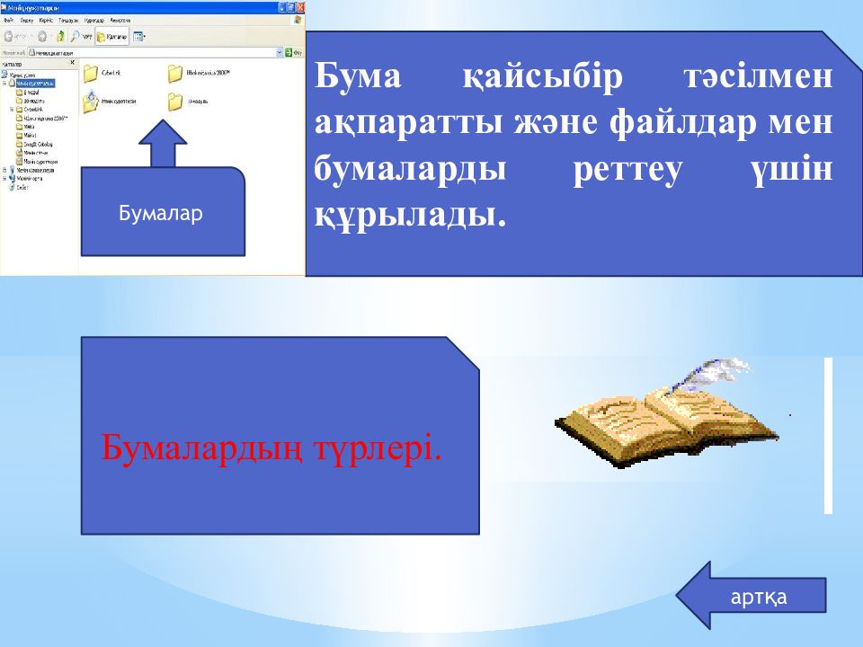 артқа Бума қайсыбір тәсілмен ақпаратты және файлдар мен бумаларды реттеу үшін құрылады. Бумалар Бумалардың түрлері.