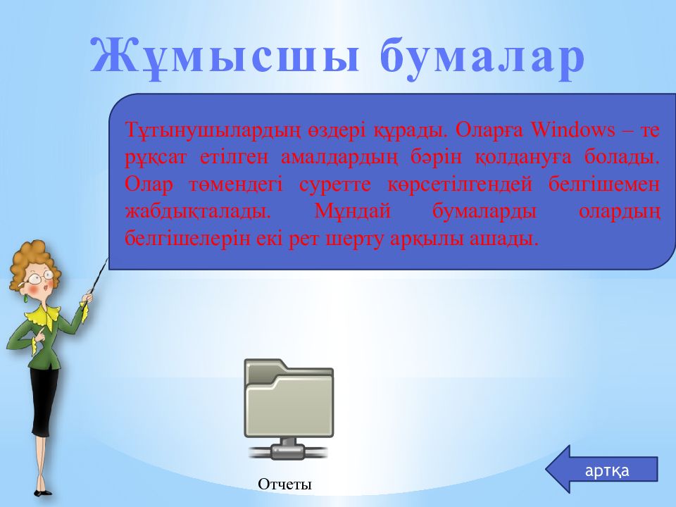 Жұмысшы бумалар Тұтынушылардың өздері құрады. Оларға Windows – те рұқсат етілген амалдардың бәрін қолдануға болады. Олар төмендегі суретте көрсетілгендей белгішемен жабдықталады. Мұндай бумаларды олардың белгішелерін екі рет шерту арқылы ашады. артқа Отчеты