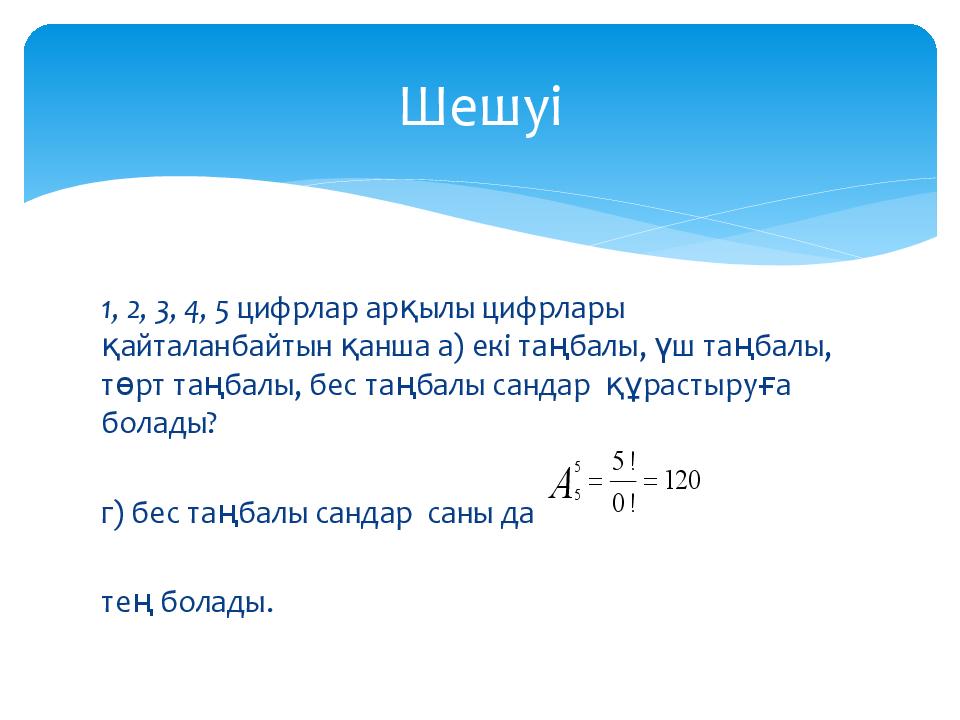 1, 2, 3, 4, 5 цифрлар арқылы цифрлары қайталанбайтын қанша а) екі таңбалы, үш таңбалы, төрт таңбалы, бес таңбалы сандар құрастыруға болады ? б ) үш таңбалы сандар саны – 5 элементтен 3 -тен алынған қайталанбайтын орналастырулар болады, онда (1) формула бойынша Шешуі =