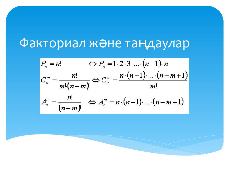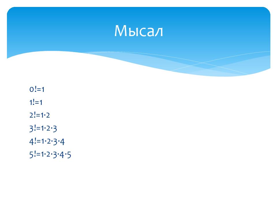 Бірден бастап n -ге дейінгі барлық натурал сандардың көбейтіндісін n факториал деп атаймыз және ол n! символымен белгіленеді. n !=1·2·3…· n 1-ескерту. 0! = 1 2-ескерту. n! =(n-1)!·n=(n-2)!·(n-1)·n Факториал