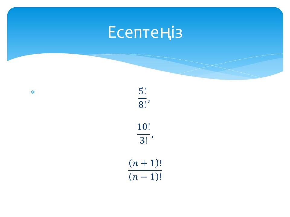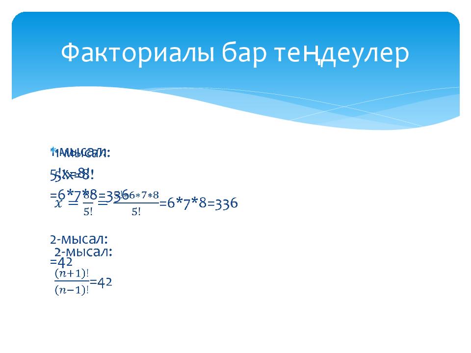 1- мысал: 5!х=8! =6*7*8=336 2-мысал: =42 Факториалы бар теңдеулер