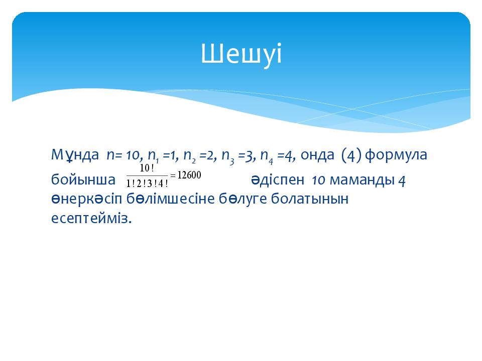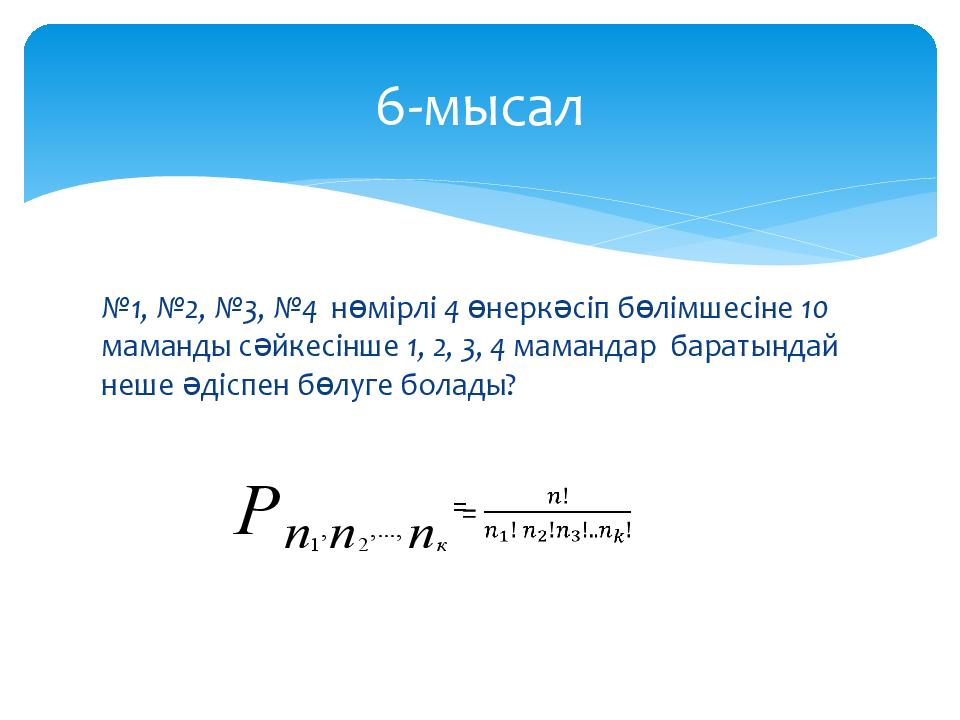 №1, №2, №3, №4 нөмірлі 4 өнеркәсіп бөлімшесіне 10 маманды сәйкесінше 1, 2, 3, 4 мамандар баратындай неше әдіспен бөлуге болады? 6-мысал =