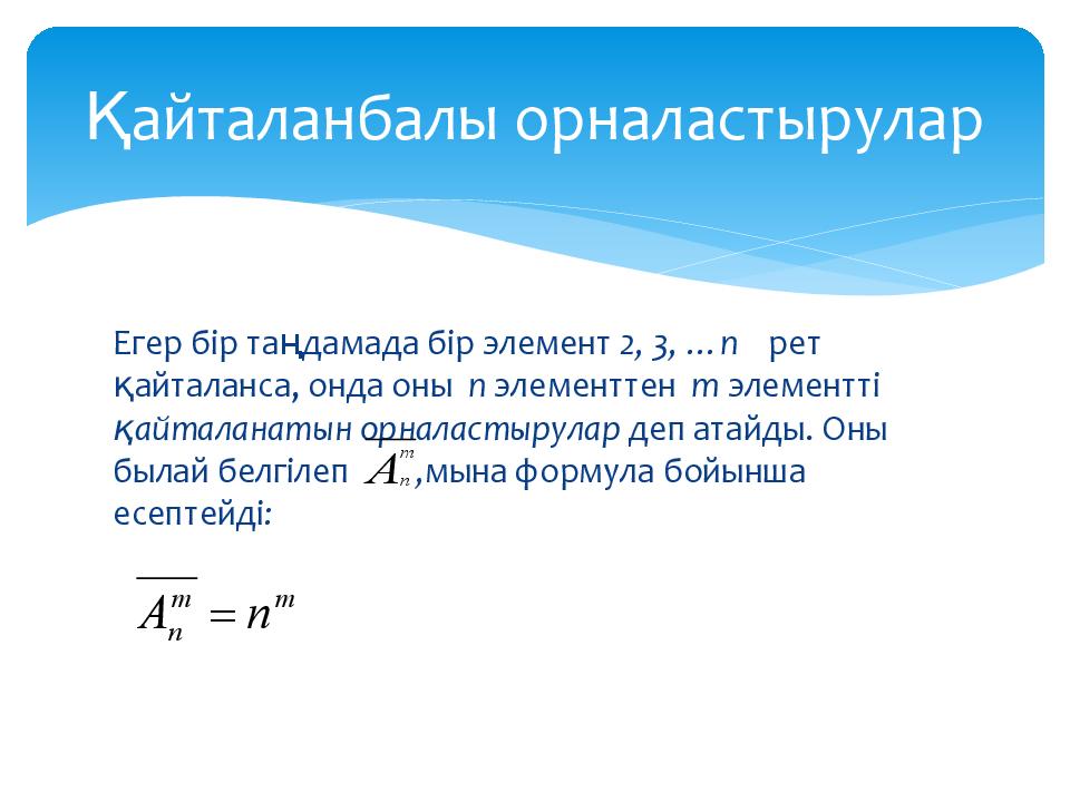 Егер бір таңдамада бір элемент 2, 3, …n рет қайталанса, онда оны п элементтен m элементті қайталанатын орналастырулар деп атайды. Оны былай белгілеп, мына формула бойынша есептейді : Қайталанбалы орналастырулар