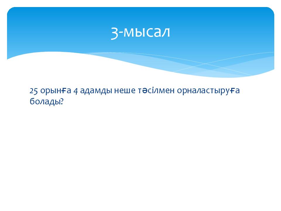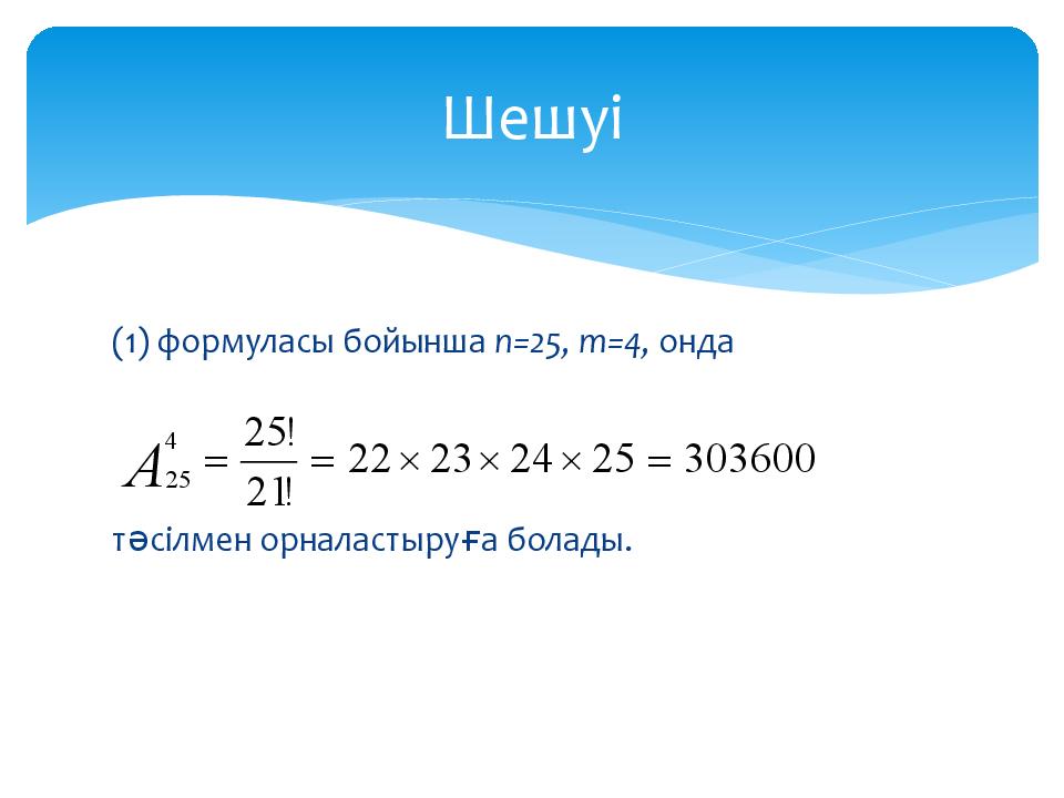 (1) формуласы бойынша n=25, m=4, онда тәсілмен орналастыруға болады. Шешуі