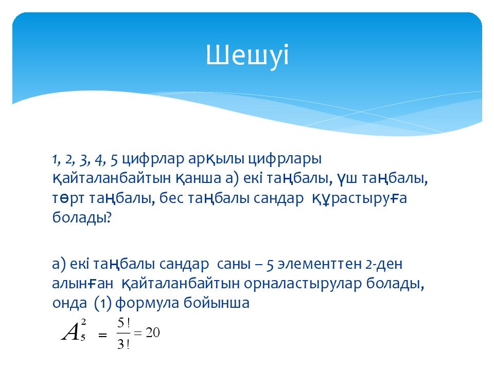 1, 2, 3, 4, 5 цифрлар арқылы цифрлары қайталанбайтын қанша а) екі таңбалы, үш таңбалы, төрт таңбалы, бес таңбалы сандар құрастыруға болады ? а) екі таңбалы сандар саны – 5 элементтен 2 -ден алынған қайталанбайтын орналастырулар болады, онда (1) формула бойынша Шешуі =
