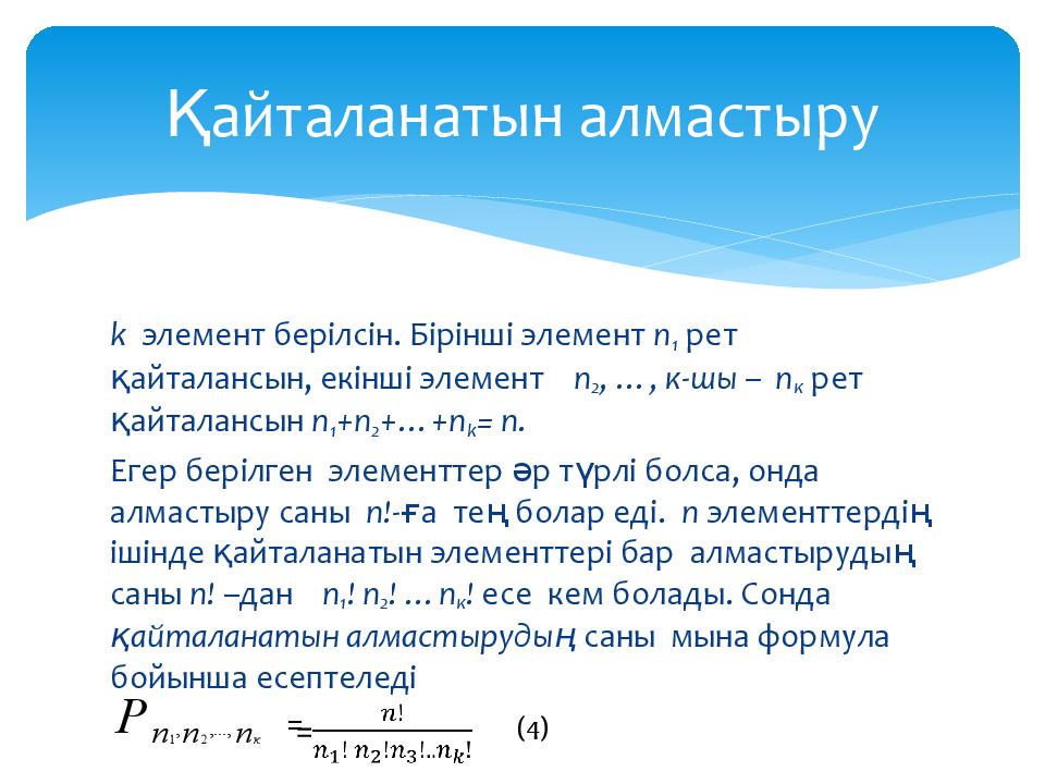 k элемент берілсін. Бірінші элемент n 1 рет қайталансын, екінші элемент n 2, …, к-шы – n к рет қайталансын n 1 +n 2 +…+n k = n. Егер берілген элементтер әр түрлі болса, онда алмастыру саны n!- ға тең болар еді. n элементтердің ішінде қайталанатын элементтері бар алмастырудың саны n! –дан n 1 ! n 2 ! …n к ! есе кем болады. Сонда қайталанатын алмастырудың саны мына формула бойынша есептеледі Қайталанатын алмастыру = (4)