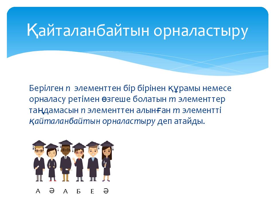 Берілген n элементтен бір бірінен құрамы немесе орналасу ретімен өзгеше болатын m элементтер таңдамасын n элементтен алынған m элементті қайталанбайтын орналастыру деп атайды. Қайталанбайтын орналастыру А Ә А Б Е Ә