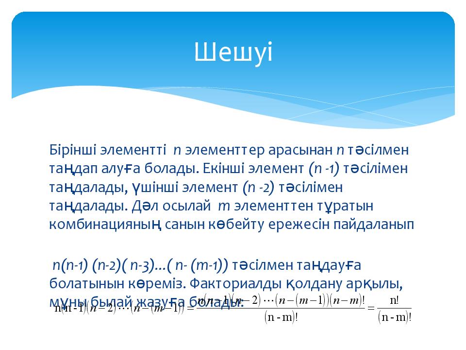 Бірінші элементті n элементтер арасынан n тәсілмен таңдап алуға болады. Екінші элемент (n -1) тәсілімен таңдалады, үшінші элемент (n -2) тәсілімен таңдалады. Дәл осылай m элементтен тұратын комбинацияның санын көбейту ережесін пайдаланып n(n-1) (n-2)( n-3)...( n- (m-1)) тәсілмен таңдауға болатынын көреміз. Факториалды қолдану арқылы, мұны былай жазуға болады: Шешуі