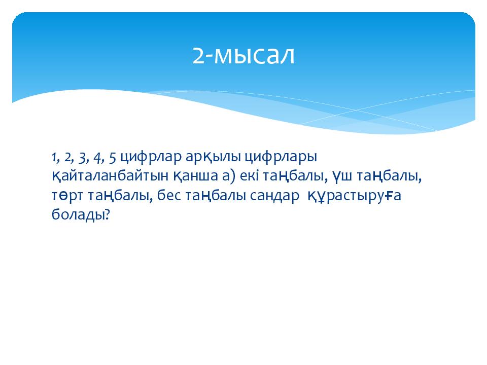 1, 2, 3, 4, 5 цифрлар арқылы цифрлары қайталанбайтын қанша а) екі таңбалы, үш таңбалы, төрт таңбалы, бес таңбалы сандар құрастыруға болады? 2- мысал